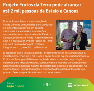 Em Dezembro de 2024 o Instituto Integrar esteve em três matérias do boletim informativo da Petrobras. As publicações tratam do Projeto FRUTOS DA TERRA, uma parceria entre o Instituto e a Petrobras que atuará na educação, formação e ações sócio ambientais, a partir da construção de hortas coletivas, localizadas nas cidades de Esteio e Canoas, que irão oportunizar o plantio, o consumo e a geração de renda em comunidades, bem como o fomento do direito à segurança alimentar e o combate à fome.