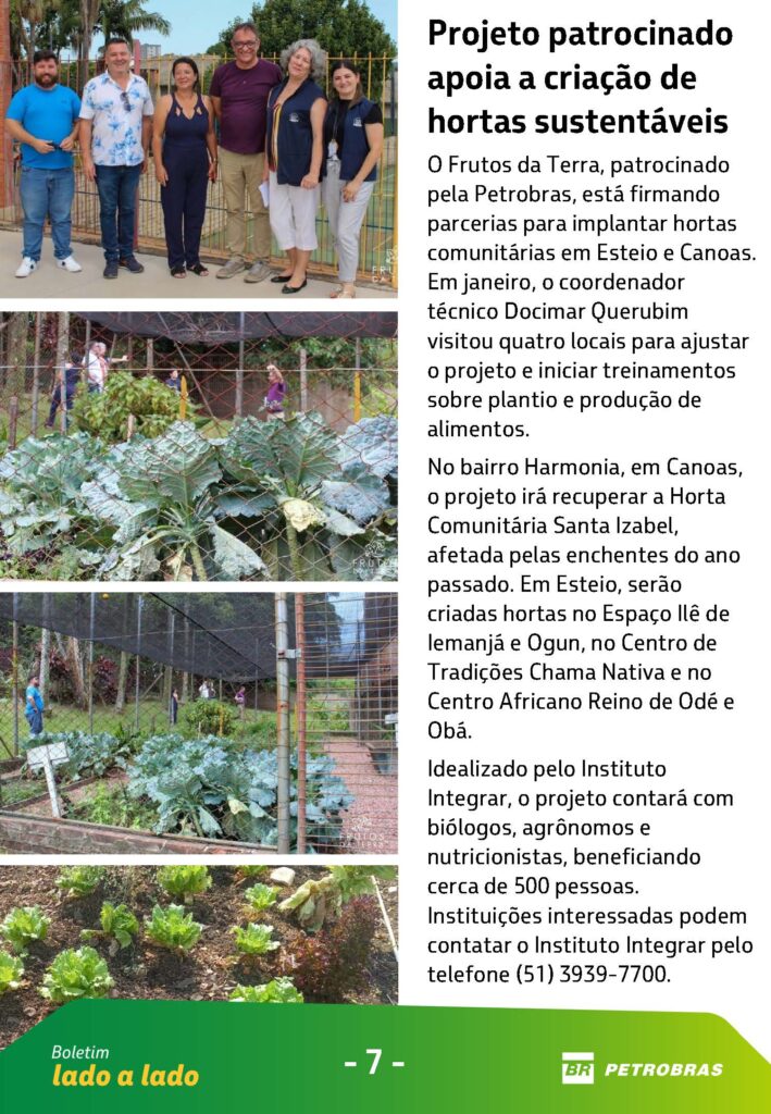 Em Fevereiro de 2025 o Instituto Integrar fez parte da publicação do boletim informativo da Petrobras. A publicação trata do Projeto FRUTOS DA TERRA, uma parceria entre o Instituto e a Petrobras que atua na educação, formação e ações sócio ambientais, a partir da construção de hortas coletivas, localizadas nas cidades de Esteio e Canoas.