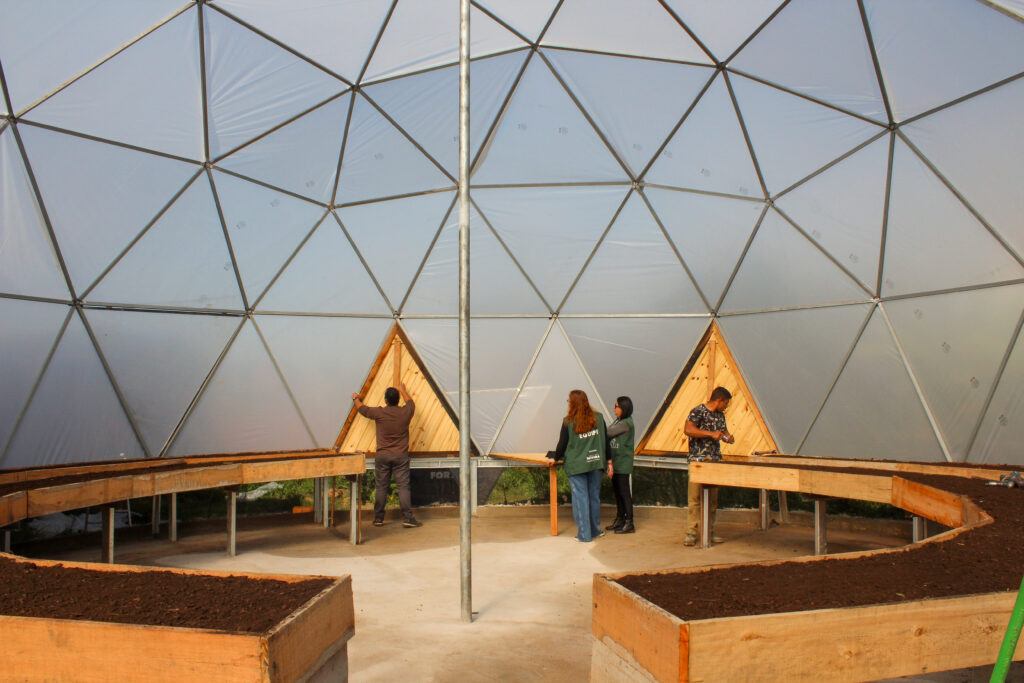 Instalada junto à Casa da Cultura Hip Hop de Esteio, a Horta Escola Dona Flora é a primeira no Rio Grande do Sul em formato geodésico, o que garante maior incidência da luz solar e um ambiente ideal para o cultivo e as práticas agroecológicas. A realização é do Instituto Integrar-RS, em parceria com a Petrobras por meio do Programa Petrobras Socioambiental.